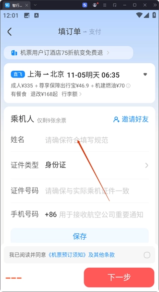 在订单填写页面,输入【乘机人】的姓名、证件号码等相关信息后,点击【下一步】按钮即可进入支付环节。