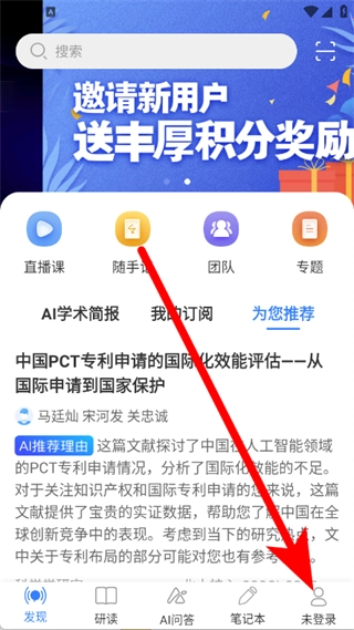 打开知网研学应用,点击底部的“未登录”选项,即可进入账号登录界面。