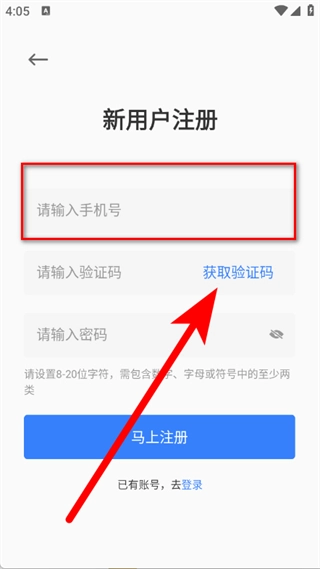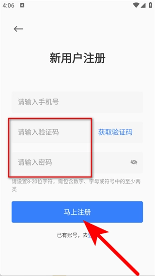 请输入验证码,设置8至20位且包含数字的密码,点击“马上注册”按钮,即可完成账号注册流程。