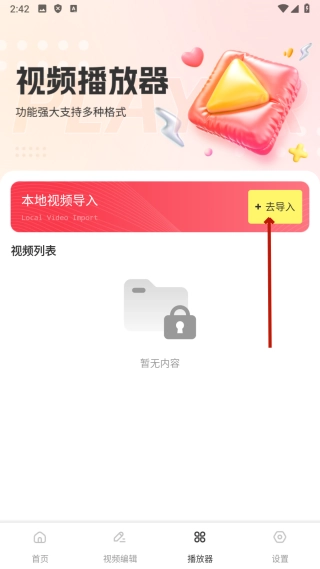 在视频播放器界面,点击【去导入】按钮,即可进入视频选择页面。