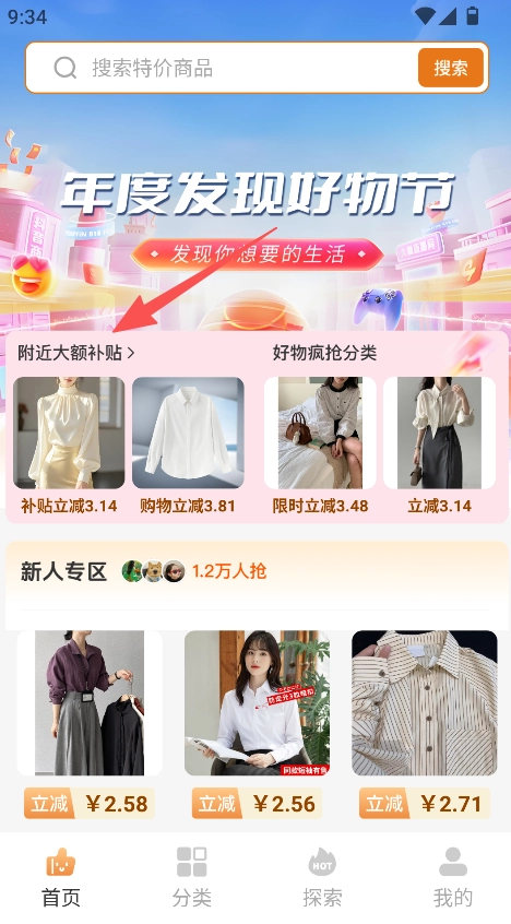 打开首页后,看看周边有哪些大额补贴活动和好物分类,从中挑选特价商品。