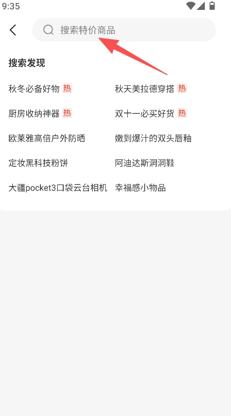 你可以通过搜索功能查找特价商品,具体操作是输入关键词,或者从搜索发现里选择热门分类。