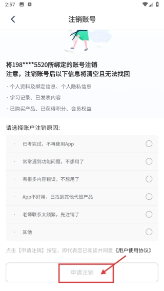 在账号注销页面,选定注销原因后,点击申请注销按钮,就能启动账号注销流程。
