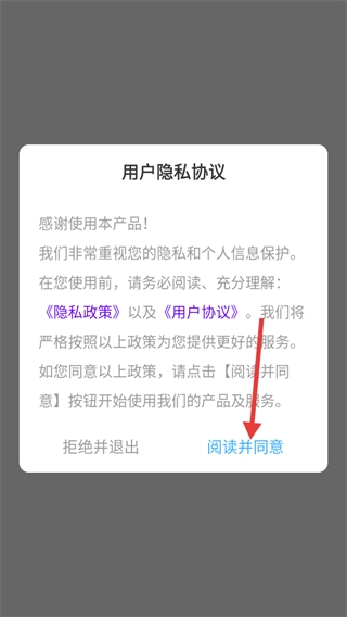 使用前请仔细阅读【隐私政策】和【用户协议】,点击【阅读并同意】按钮即可进入软件。