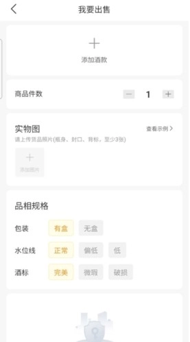 在“我要出售”页面填写货品的相关属性,按照流程操作就能完成售酒。
