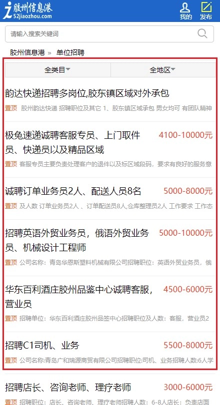 比如招聘信息,点击进入,这里有全类目全地区的单位招聘信息。