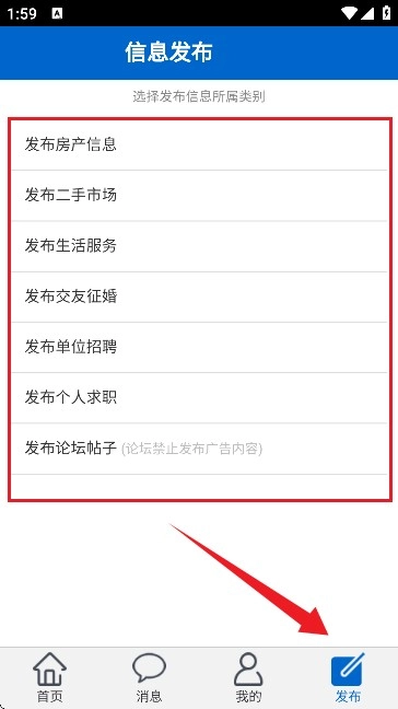 然后在【发布】功能里同样可以发布各类信息帖子,像图中展示的那样,涵盖房产、二手交易、生活服务、交友征婚、招聘求职等多种类型。
