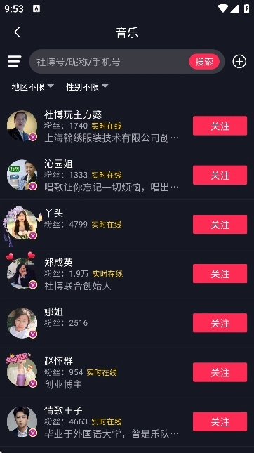 然后挑选一个自己感兴趣的板块进入就可以了。像【音乐】这个板块,就能为你推荐和展示许多用户。
