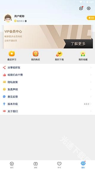 进入软件的【首页】后,我们可以看到课程、听书专区、英语词典等常用功能的入口。
