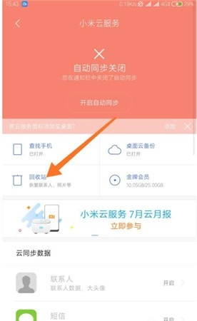 打开小米云服务后,点击箭头指向的“回收站”,再选择“查看云端数据”。