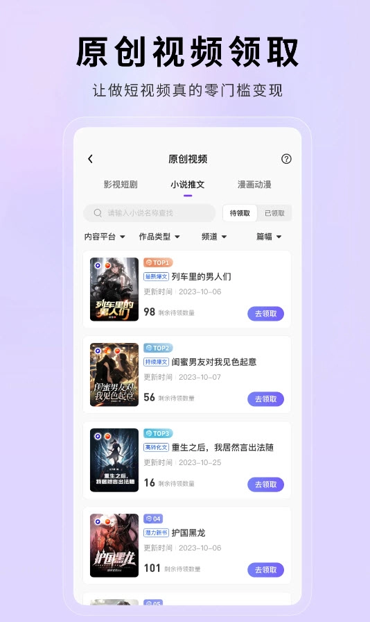 精品实用课程——凝聚数十万创作者的实战经验,覆盖从新手到资深的全阶段创作者需求。提供保姆级的运营策略、剪辑技巧、内容选题等实操教学,助力学员快速掌握高效变现能力 2、热门变现方式——整合全市场内容赛道的最全高效变现玩法,具备低门槛、无限制的特点,即使是零基础达人也能快速开启变现之路 3、优质视频领取——精选市场热门变现视频模型与原创优质内容,领取后即可参与相关任务发布,让创作与变现过程更简单高效 4、实用创作辅助工具——涵盖一键成片、智能配音、链接转文字、视频转文字、去水印等多功能辅助工具,全方位降低创作难度,让创作更轻松