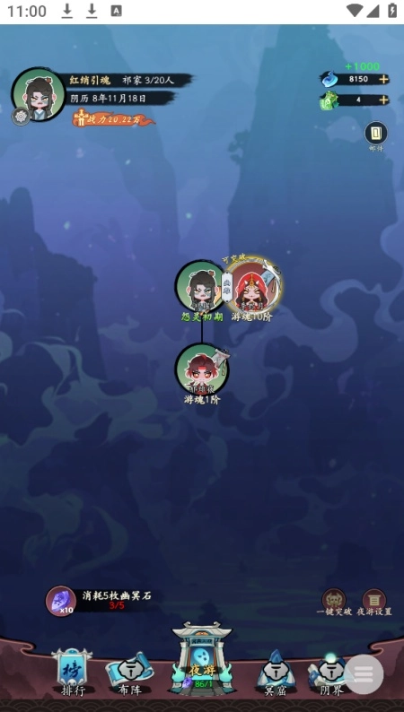 操作流程:启动游戏后,玩家需持续点击对话来进入游戏环节,接着转动命盘确定妖怪种族,完成名字修改后就能开启妖界冒险。此外,还能通过点击操作开展夜游活动,以此收集装备、增强属性等。