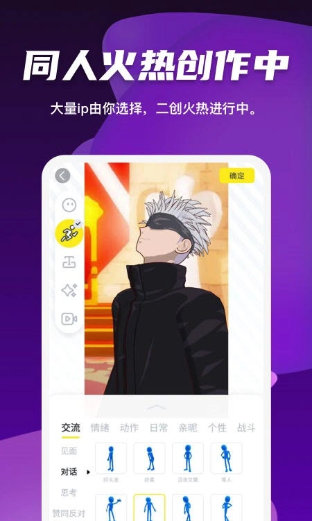 在这里你可以挑选动漫人物模型,添加动作、背景特效、表情台词等元素,和亲友或者素不相识的陌生人来一场跨次元大乱斗,超简易的Mmd制作功能,点击就能立刻成为同人动画制作大神~