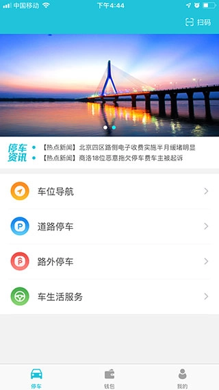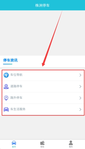 首页设有车位引导、路边停车、场库停车以及车辆相关生活服务的查询功能。