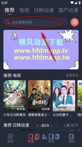 要启动横风动漫,第一步是在“频道”界面找到顶部的搜索框,然后直接点击它。