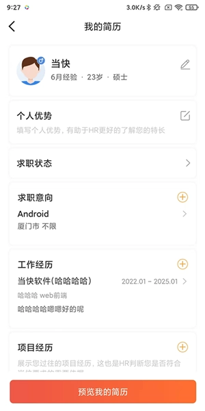 你可以在这个页面完善自己的在线个人简历,也能点击下方的按钮来预览简历。