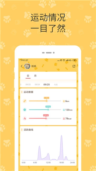 记录宠物每日的运动时长、运动距离及消耗热量。