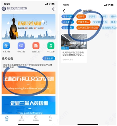 杭州市主要负责人与生产加工型小微企业之间存在对应关联,通过这一关联能够找到杭州市针对生产加工型小微企业主要负责人开展的培训。点击进入该培训后,用户可以查看基础培训信息和相关课程,当学习时长达到规定要求时,即可参加考试。