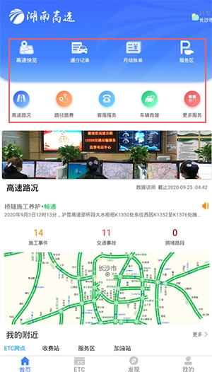 在本站安装湖南高速通并运行该软件后,能看到首页、ETC、发现、我的这四个板块。