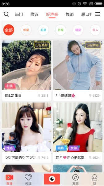 在附近分类里,能找到离我们最近的主播,位置是可以随意切换的。进入好声音分类后,我们能快速看到一些排名很靠前的主播,用户可以选择关注这些主播,方便后续观看。