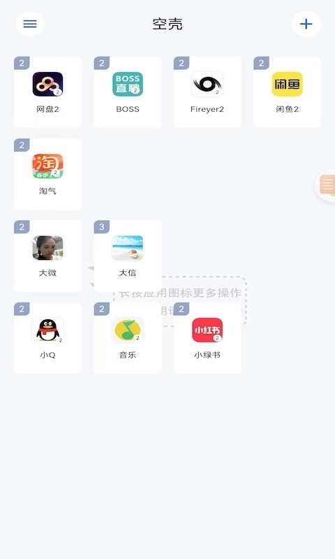 空壳是一款适配安卓15.0系统的分身多开工具,可支持当前主流热门应用与游戏的多开操作,助力用户实现多账号自由管理。其切换流程十分简便,无需重复登录,直接打开对应分身即可快速完成账号切换,大幅提升使用效率。在游戏运行过程中,能为用户带来流畅清爽的体验,且软件整体运行稳定可靠,感兴趣的用户不妨前来体验。