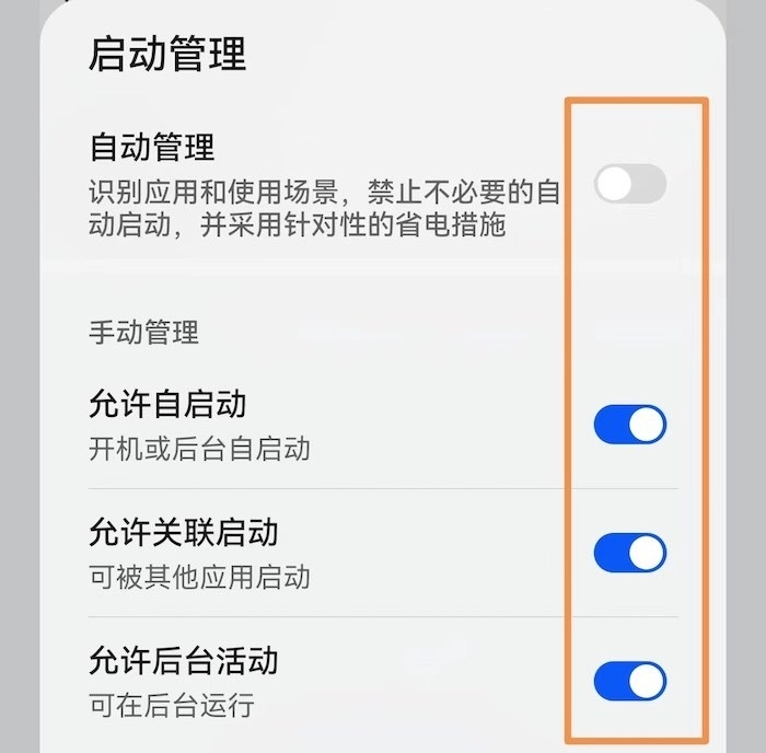 选择空壳应用,关闭自动管理功能,开启手动管理模式:允许该应用自启动、允许其关联启动、允许其在后台运行活动。