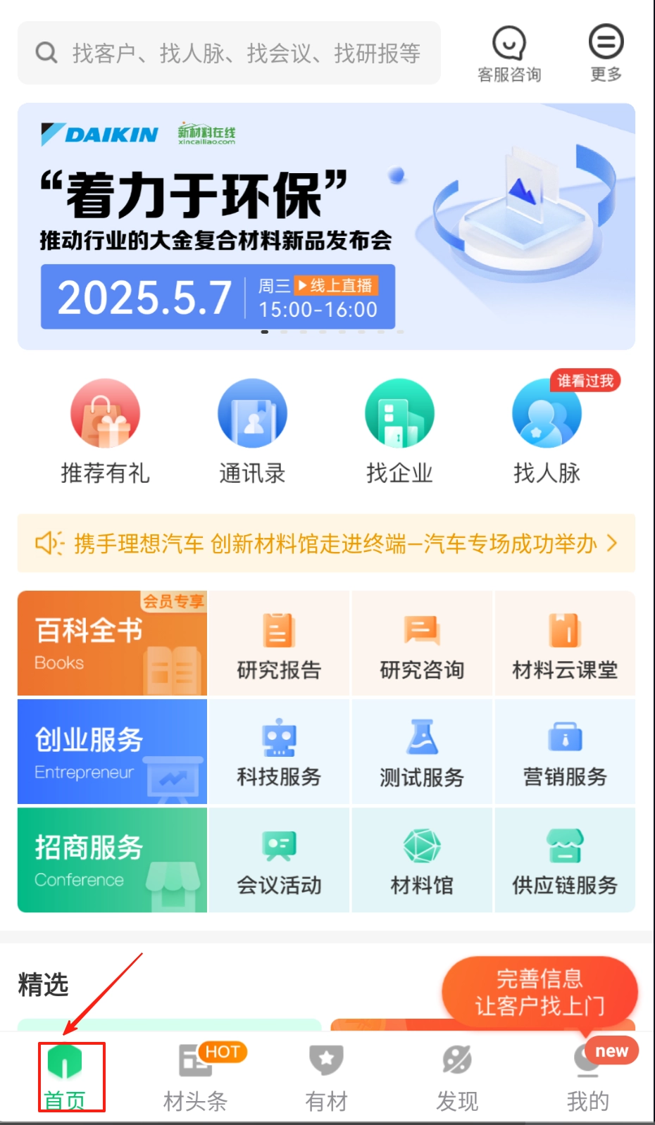 打开应用后进入首页,你可以浏览行业动态,也可以通过搜索功能查找特定的材料资讯。