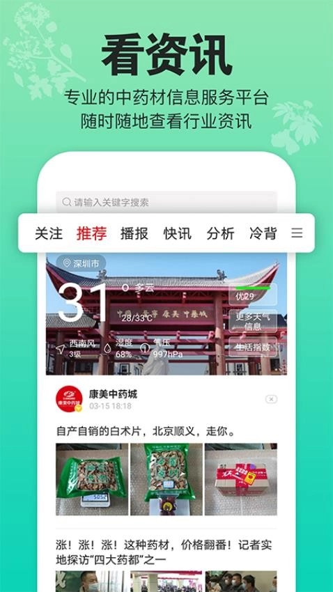 在首页资讯板块可以浏览每日更新的行业政策解读和市场趋势报告,借助顶部搜索栏输入关键词,就能快速定位到具体药材的深度分析文章。