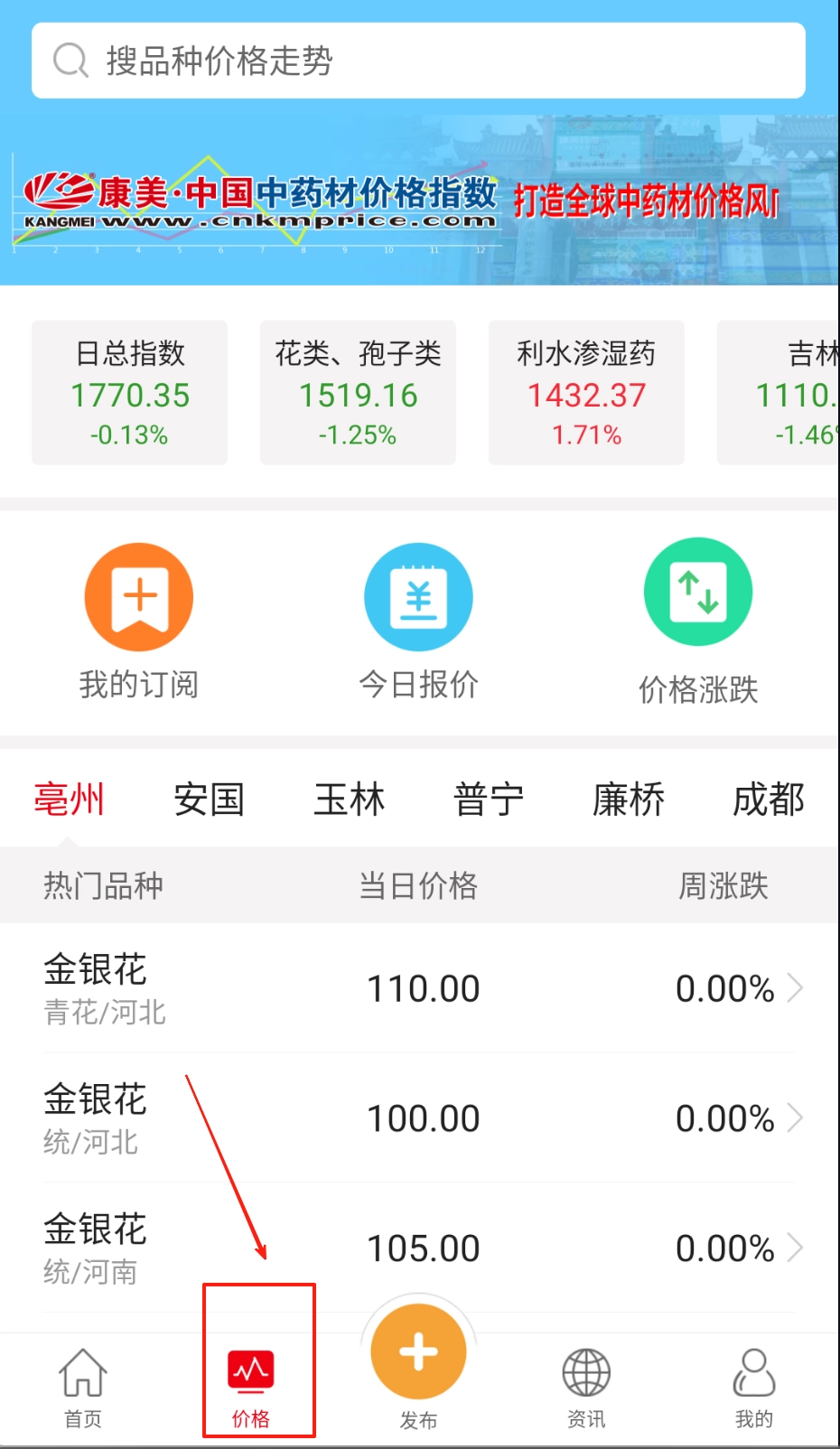 进入价格指数界面后,选择对应的药材品类,即可查看全国主要交易市场的实时报价曲线;若需设置价格异动提醒,点击订阅按钮即可实现该功能。