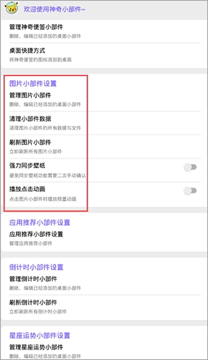 在图片小部件的设置界面中,包含管理图片小部件、清理图片小部件、强力同步壁纸等功能选项。