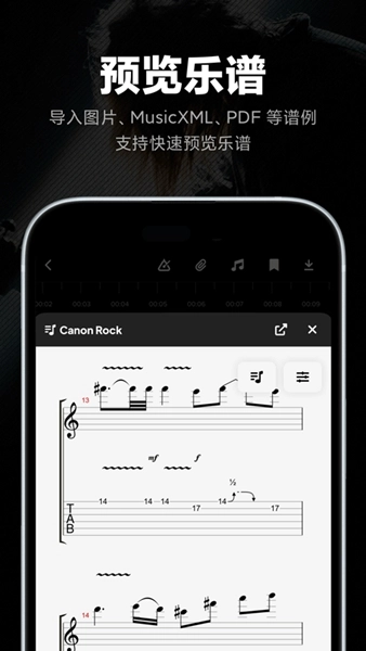 音乐附件功能:支持导入各类音乐相关的附件,并且能够预览播放Guitar Pro、MusicXML格式的乐谱文件。