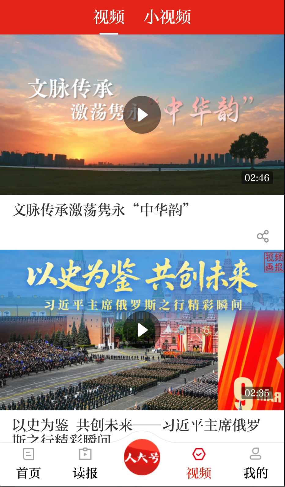 主界面依据频道分类来推荐内容,用户可通过左右滑动屏幕在视频报道和图文快讯之间进行切换,点击顶部的“读报”按钮就能打开当日的电子版报纸。