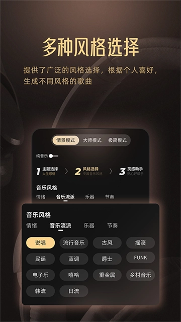 从古典到现代,从爵士到电子,Muse AI 提供了丰富多样的风格选择,使你可以依据个人喜好创作出别具一格的歌曲。