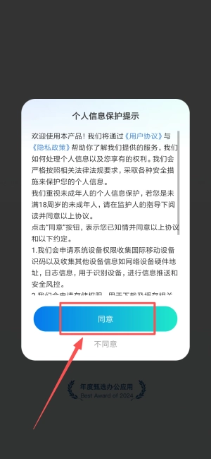 打开软件后,先阅读个人信息保护提示,再点击同意按钮,即可进入应用。