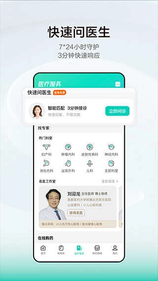 快速问医生:借助智能系统精准匹配科室,平均3分钟即可实现极速接诊,更有7×24小时全天候守护服务。