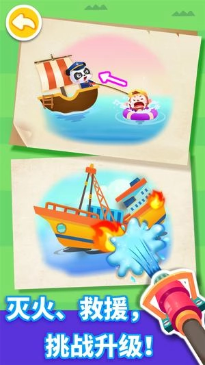 小伙伴们掉进水里啦,宝宝能来帮帮它们吗?把救生圈扔过去,就能把它们救起来哦。瞧,有船着火了,赶紧用消防泡沫把大火扑灭吧。人鱼公主被困住了,宝宝变成小骑士,剪开海草、打开铁锁,把公主救出来啦,宝宝真厉害!