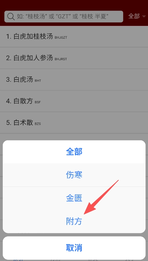 该文本具备方剂分类查询功能,可支持伤寒、金匮、附方等分类的选择,助力用户快速定位并学习相关方剂。