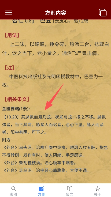 条文关联功能实用便捷,点击即可跳转查看相关条文内容,能有效助力理解方剂的临床应用场景,提升学习体验。