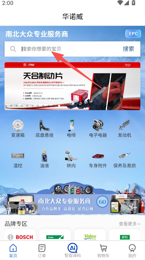 进入首页,使用搜索功能查找目标汽车配件。