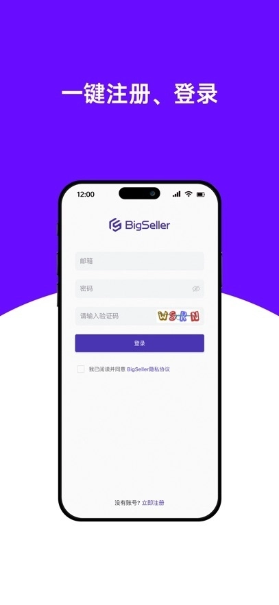 打开BigSeller,进入首页后点击“立即注册”按钮;依次填写手机号码、图形验证码、短信验证码以及登录密码,勾选“同意BigSeller隐私协议”选项,最后点击“注册”按钮即可完成注册流程。