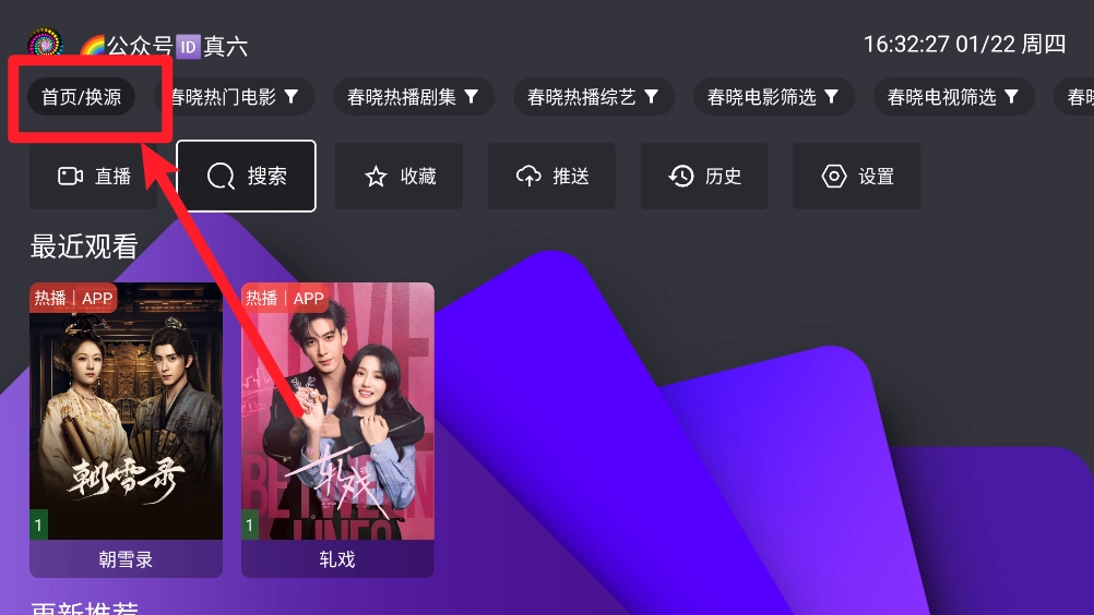 打开软件后,在主页点击"首页/换源"。