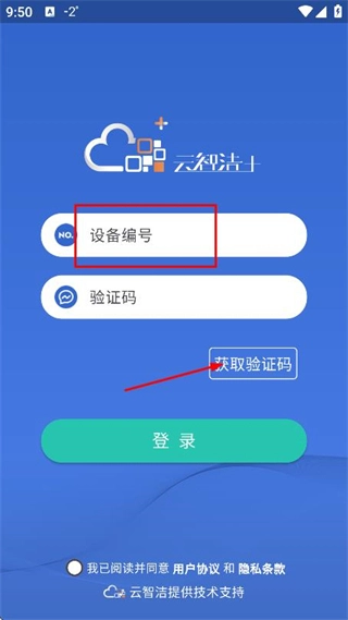 在登录页面输入设备编号,勾选相关协议后,点击“获取验证码”按钮。