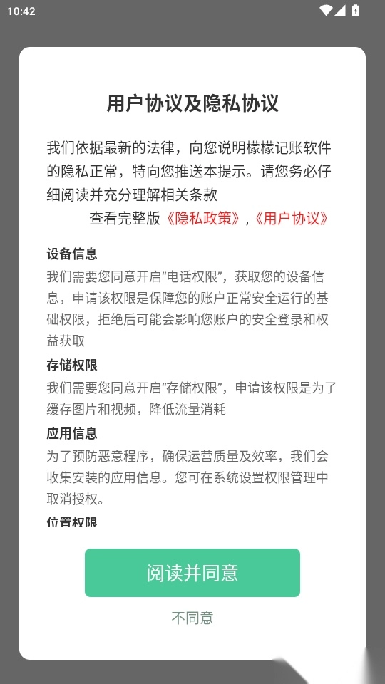 打开软件后阅读《用户协议及隐私协议》,点击“阅读并同意”按钮即可进入。