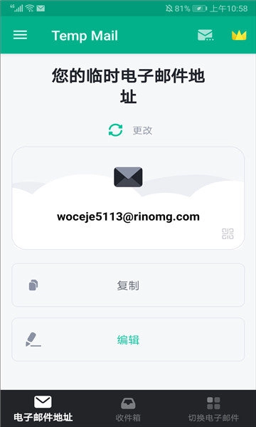打开无限邮箱软件后,我们会看到如下图呈现的内容,其中包含系统免费提供给我们的一个邮箱。