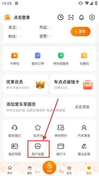 打开应用后,进入“我的”页面,找到并点击【商户加盟】按钮,即可进入商户加盟界面。