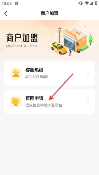 在【商户加盟】界面里,点击【申请】选项,即可进入申请入驻平台的页面。