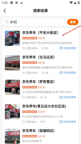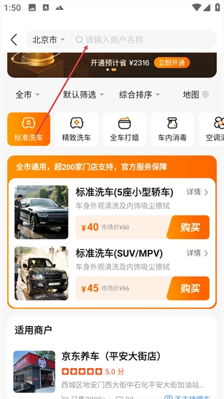 点击顶部搜索框,输入洗车店名称,进行搜索。