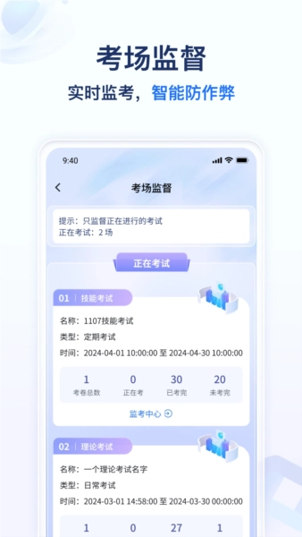 还配备了线上实时考场监督功能,助你实时监考,轻松达成智能防作弊目标。