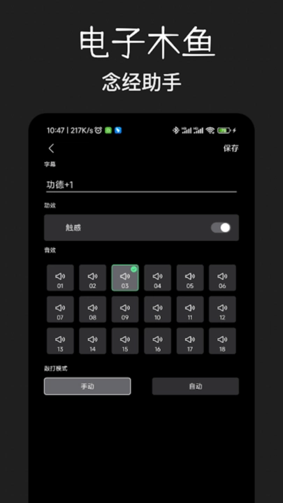 支持木制敲鱼工具的使用功能,网上有大量丰富的音频资源可供获取,并且可以自由挑选各类不同的音效。