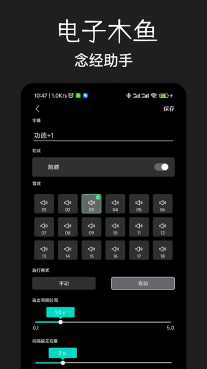 提供多种木鱼音色供选择,支持自定义悬浮文字,像 “功德 + 1”“烦恼 - 1” 等文字都能设置。